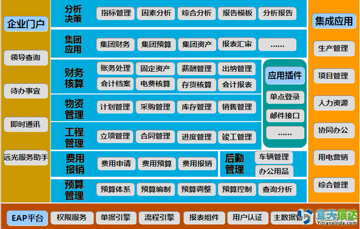 Ø 利用EAP平臺(tái)門戶完成同平臺(tái)的客制化開發(fā),快速響應(yīng)個(gè)性化需求。實(shí)現(xiàn)單體企業(yè)內(nèi)業(yè)務(wù)信息的橫向集成,縱向貫通。