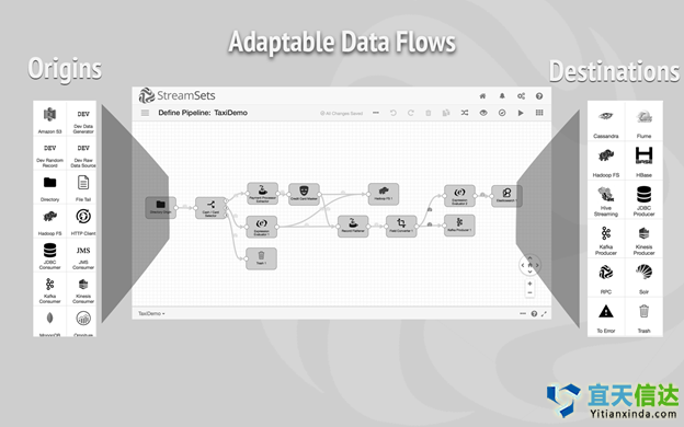 Google Data Flow為數(shù)據(jù)相關(guān)的任務(wù)提供了管理、監(jiān)視和安全能力。Sources和Sink可在管線中抽象地執(zhí)行讀寫(xiě)操作,管線封裝而成的整個(gè)計(jì)算序列可以接受外部來(lái)源的某些輸入數(shù)據(jù),通過(guò)對(duì)數(shù)據(jù)進(jìn)行轉(zhuǎn)換生成一定的輸出數(shù)據(jù)。了解詳情StreamSets:StreamSets是一種專(zhuān)門(mén)針對(duì)傳輸中數(shù)據(jù)進(jìn)行過(guò)優(yōu)化的數(shù)據(jù)處理平臺(tái),提供了可視化數(shù)據(jù)流創(chuàng)建模型,通過(guò)開(kāi)源的方式發(fā)行。該技術(shù)可部署在內(nèi)部環(huán)境或云中,提供了豐富的監(jiān)視和管理界面。