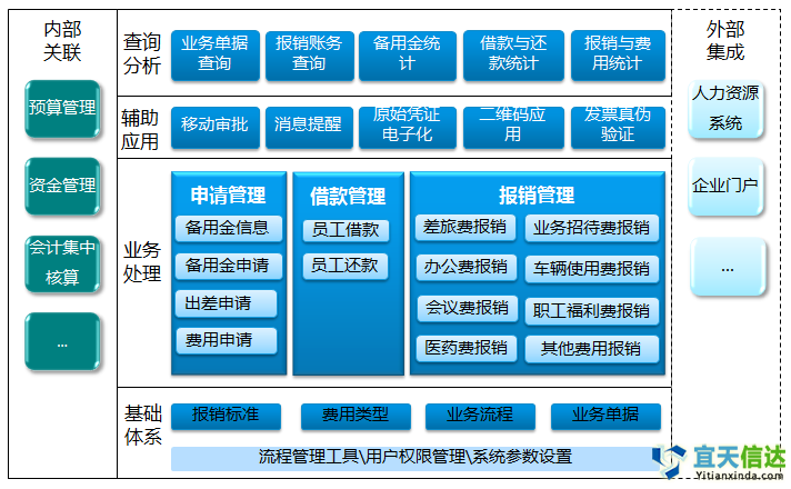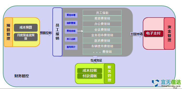 員工報銷其與預(yù)算管理模塊、資金管理模塊、賬務(wù)模塊無縫銜接。通過預(yù)算控制方案進行成本預(yù)算和現(xiàn)金流預(yù)算控制;對無需付款業(yè)務(wù)可以直接生成財務(wù)憑證;對于需進行付款的報銷業(yè)務(wù),直接發(fā)起電子支付申請,付款后自動生成記賬憑證,提高核算和支付效率。